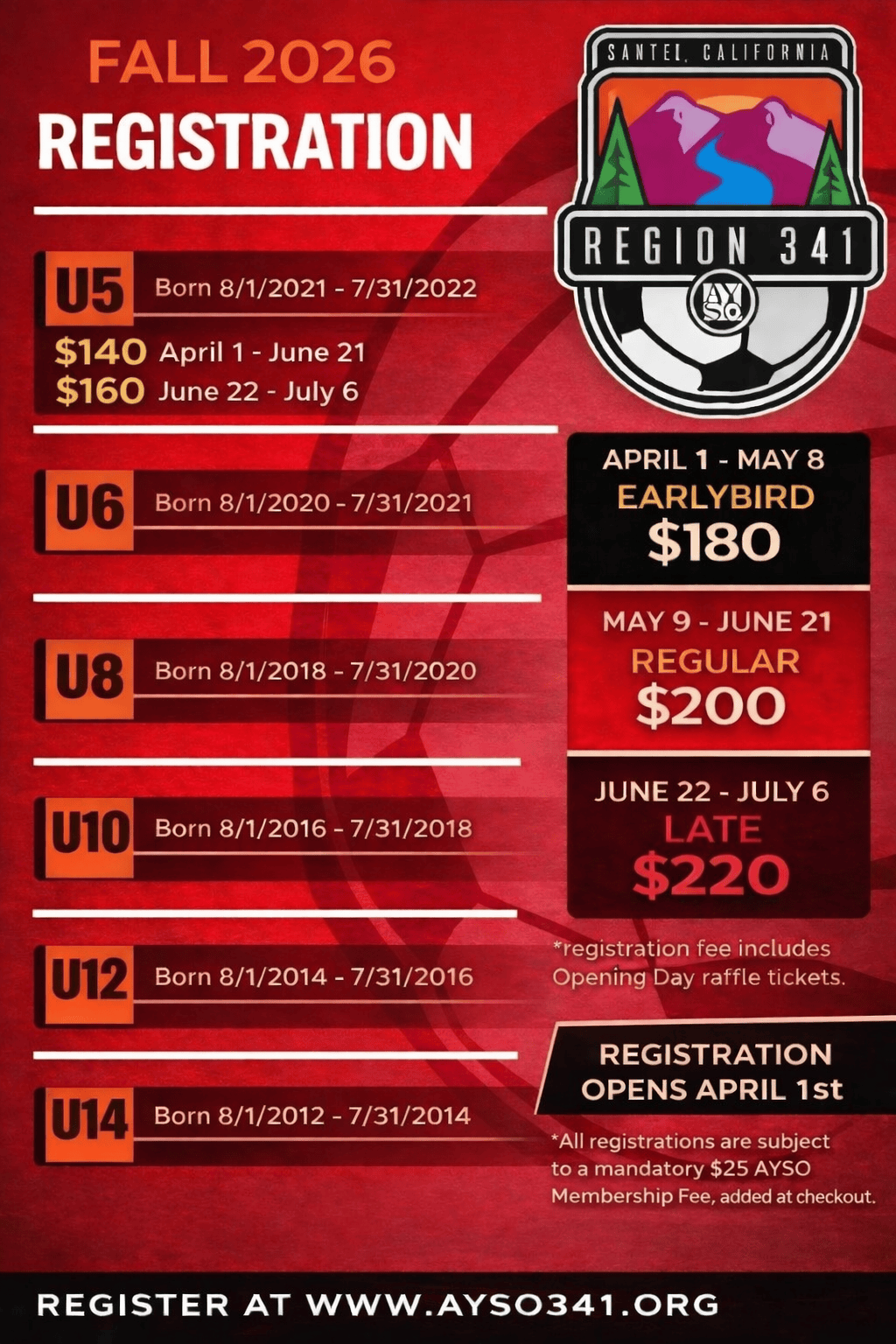 Fall 2026 Registration Opens April 1, 2026. Register Online on April 1st by clicking on the "Log In" or "Register Now" buttons above or viewing the Registration Listing and clicking "Register Now" next to the age division.